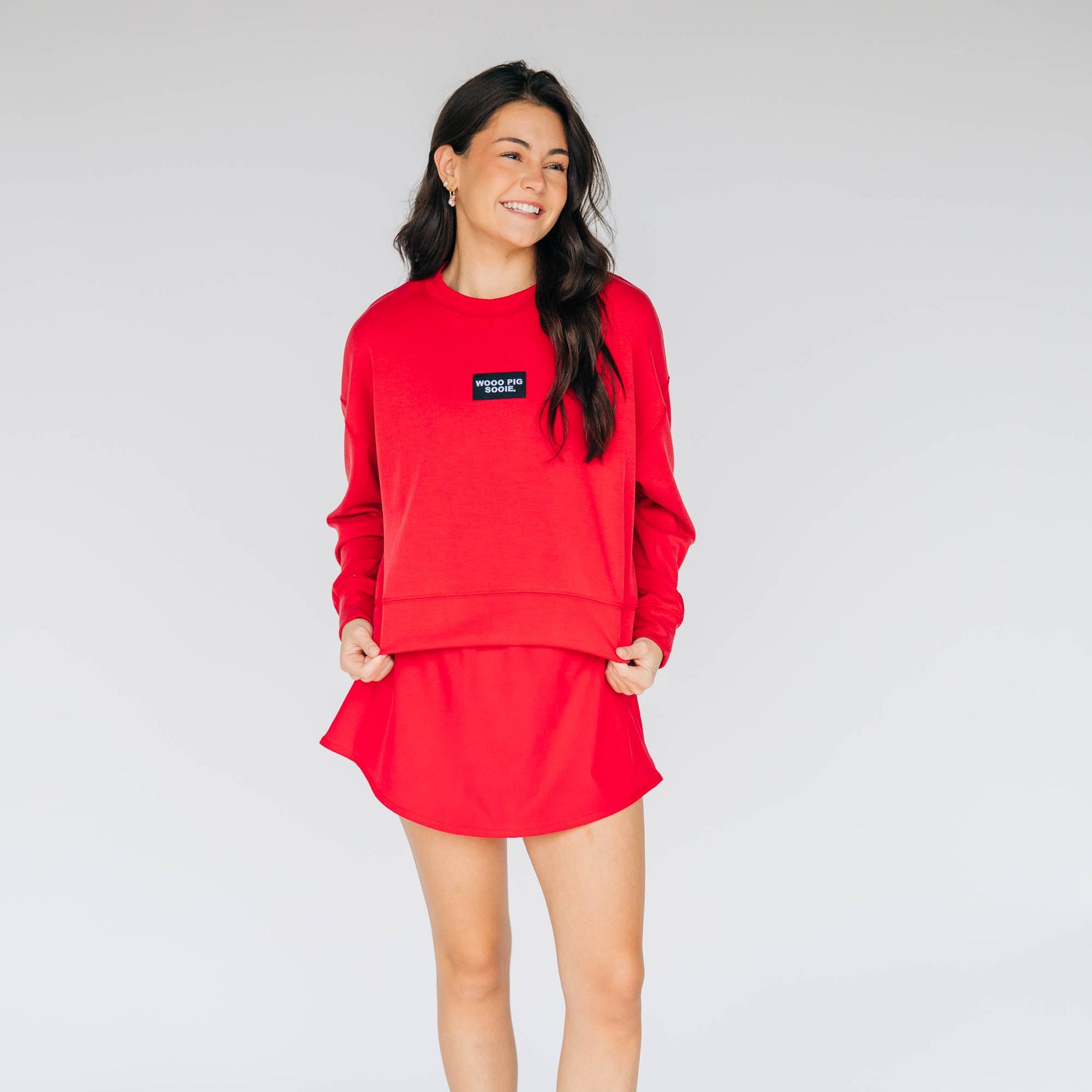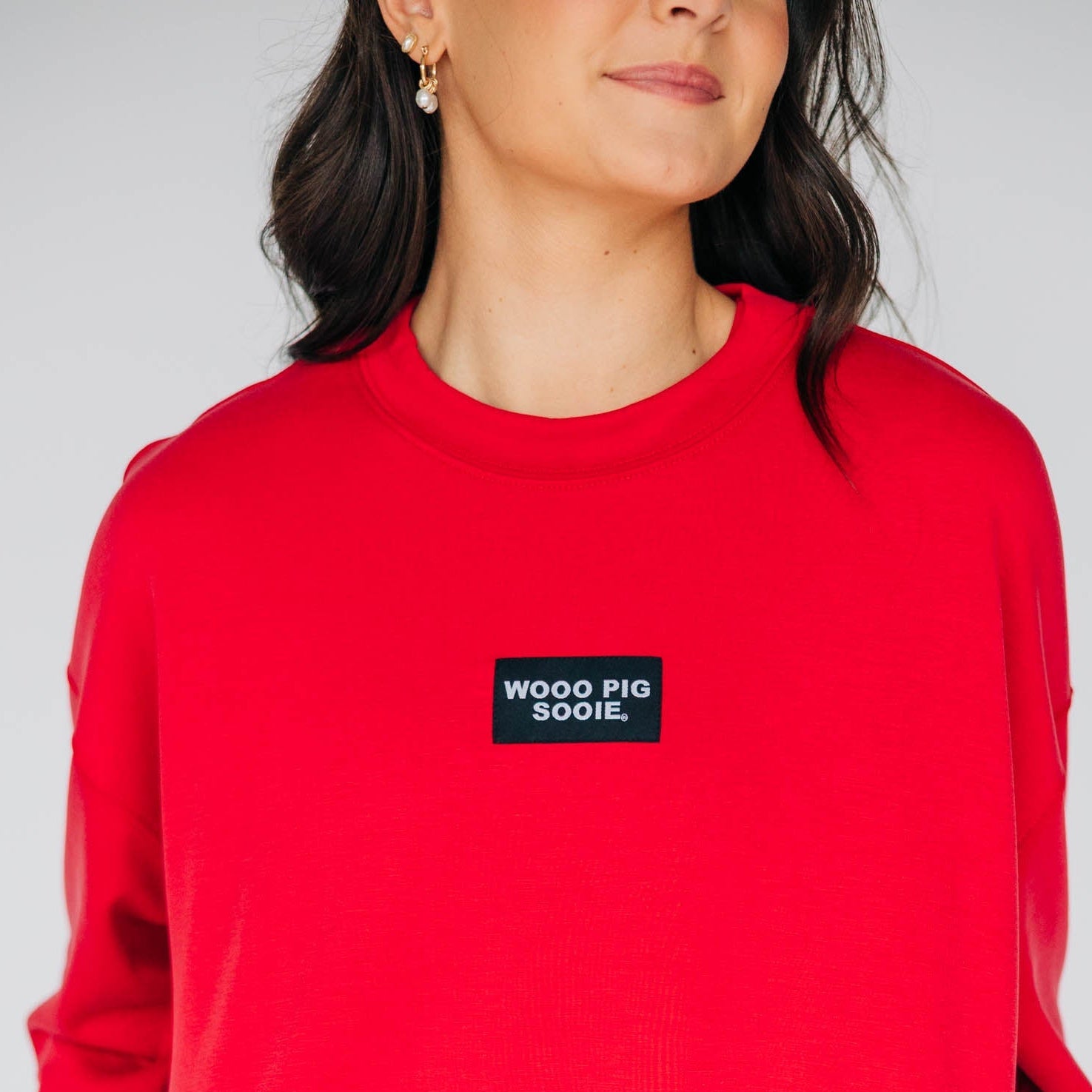 The Ava Airy Crewneck Wooo Pig Sooie Woven Label | Crimson