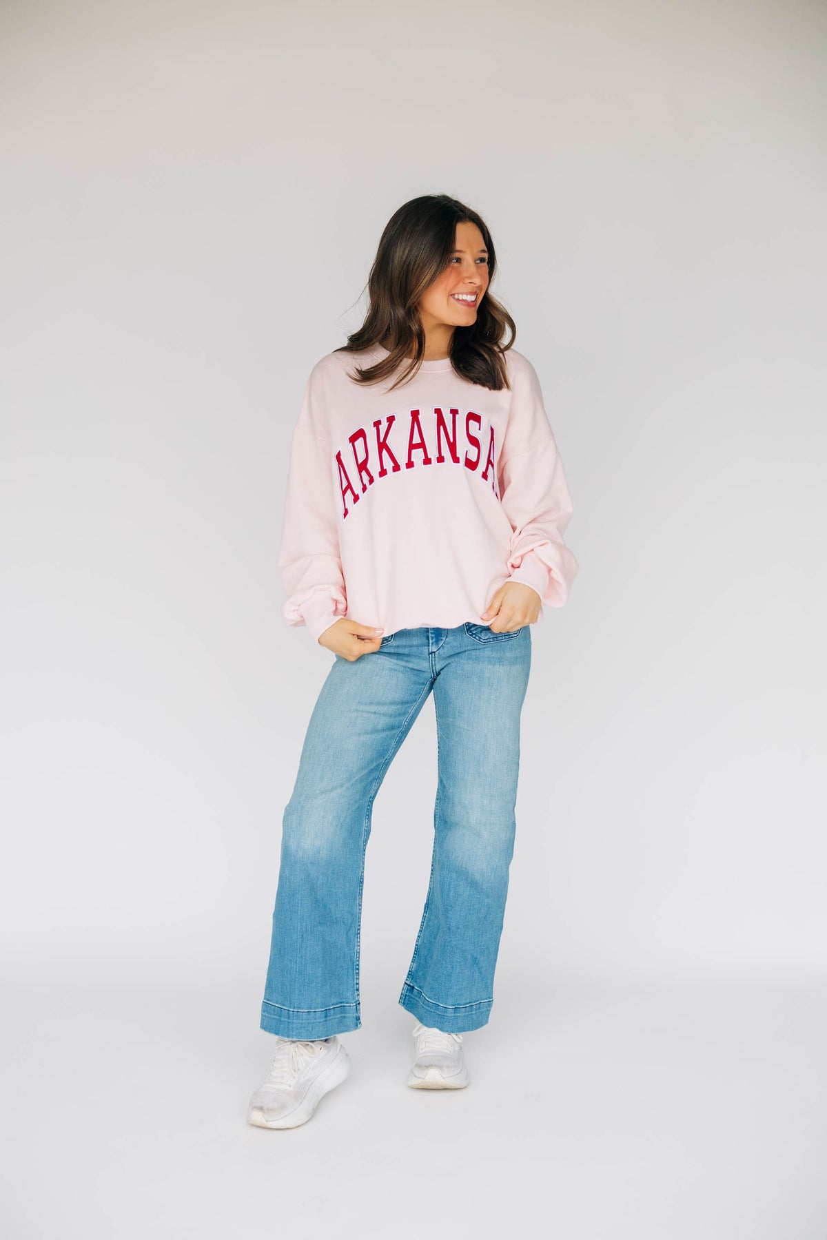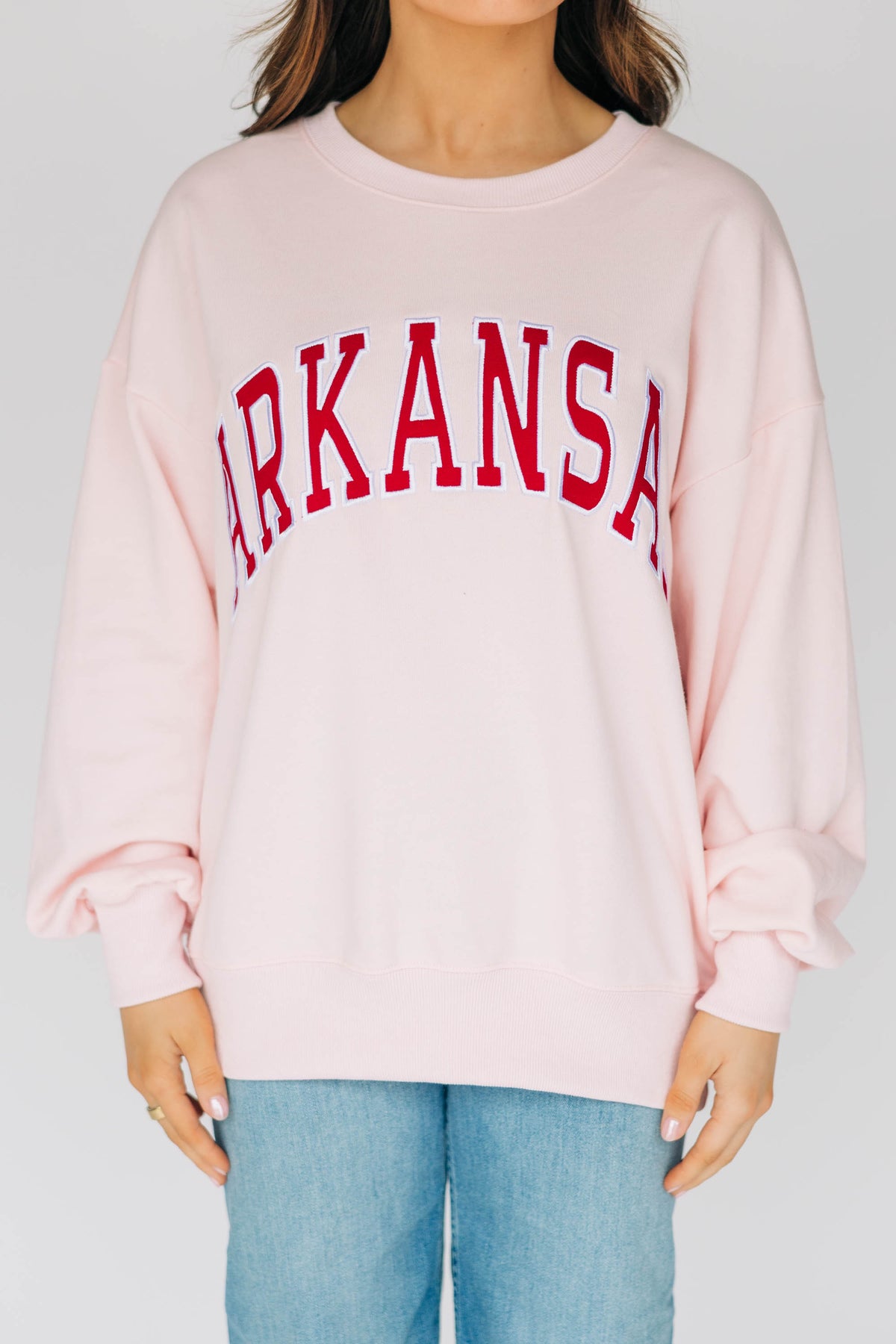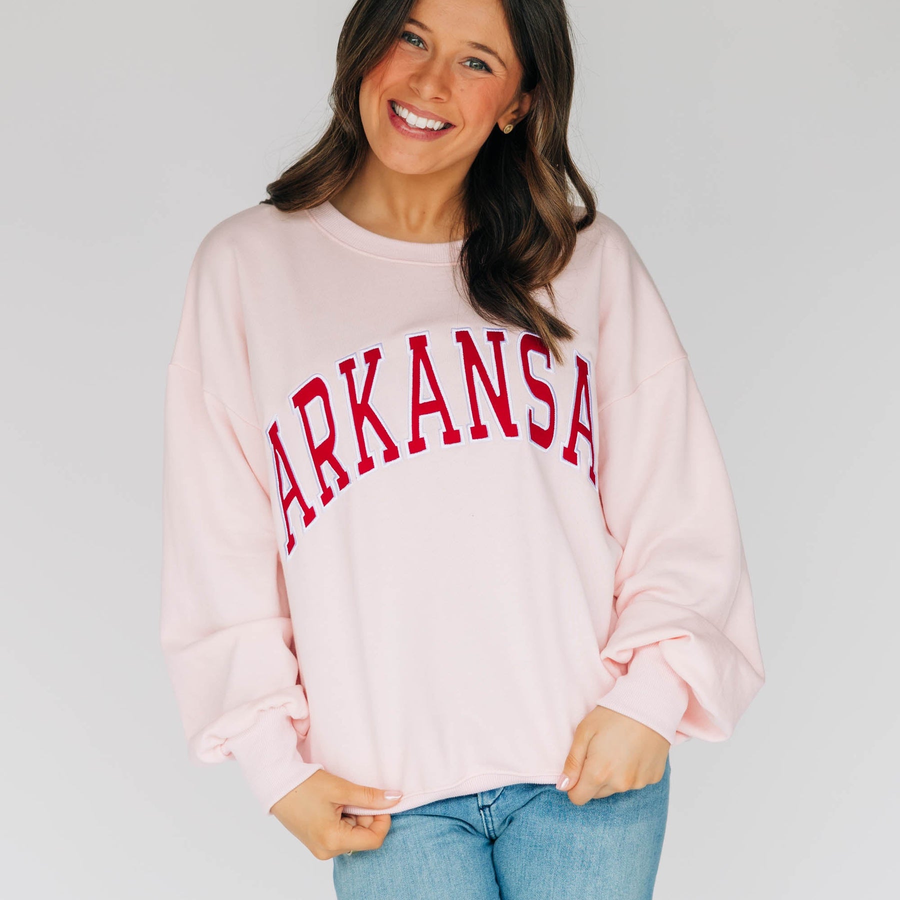 Meet the Mallory Crewneck! Featuring a high quality applique arch ARKANSAS on a stunning light pink color!