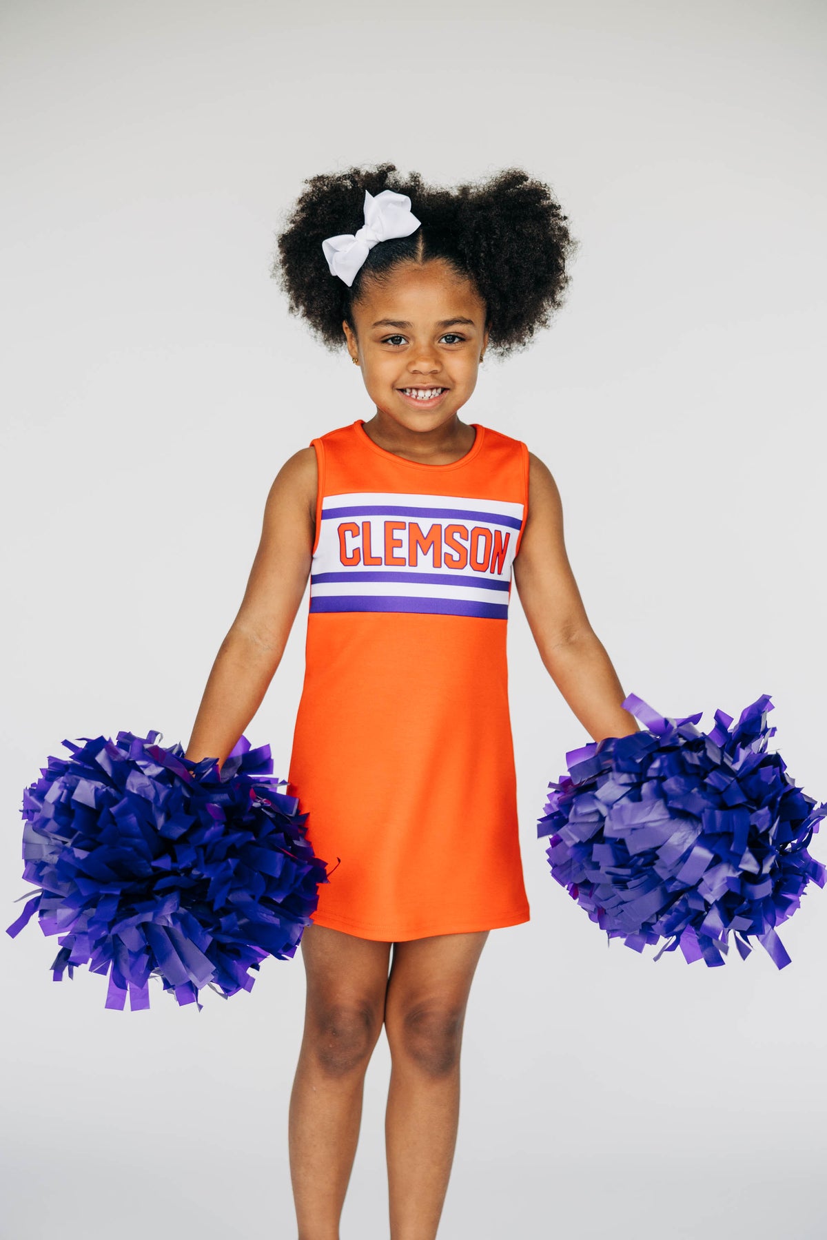 Meet our new officially licensed striped cheer dress! Made of 46% polyester, 46% rayon, and 8% spandex, our dresses are unbelievably soft and so comfortable that your daughter will be ready to cheer on her team all game day long!