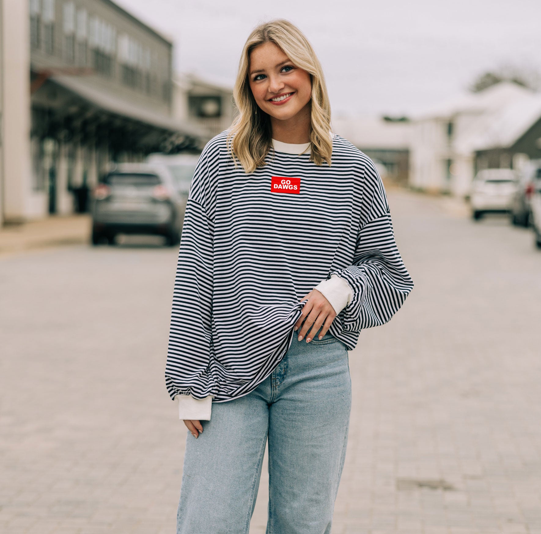 An effortless oversized fit with all-day comfort in mind. The Stadium Stripe Top is soft, lightweight, and perfectly drapey for an easy, throw-on-and-go look. Designed with a relaxed, flowy silhouette that moves with you—never stiff or heavy. You can size down one for a less oversized fit, but it’s meant to feel laid-back and breezy. Perfect for game days, weekends, and everything in between.
