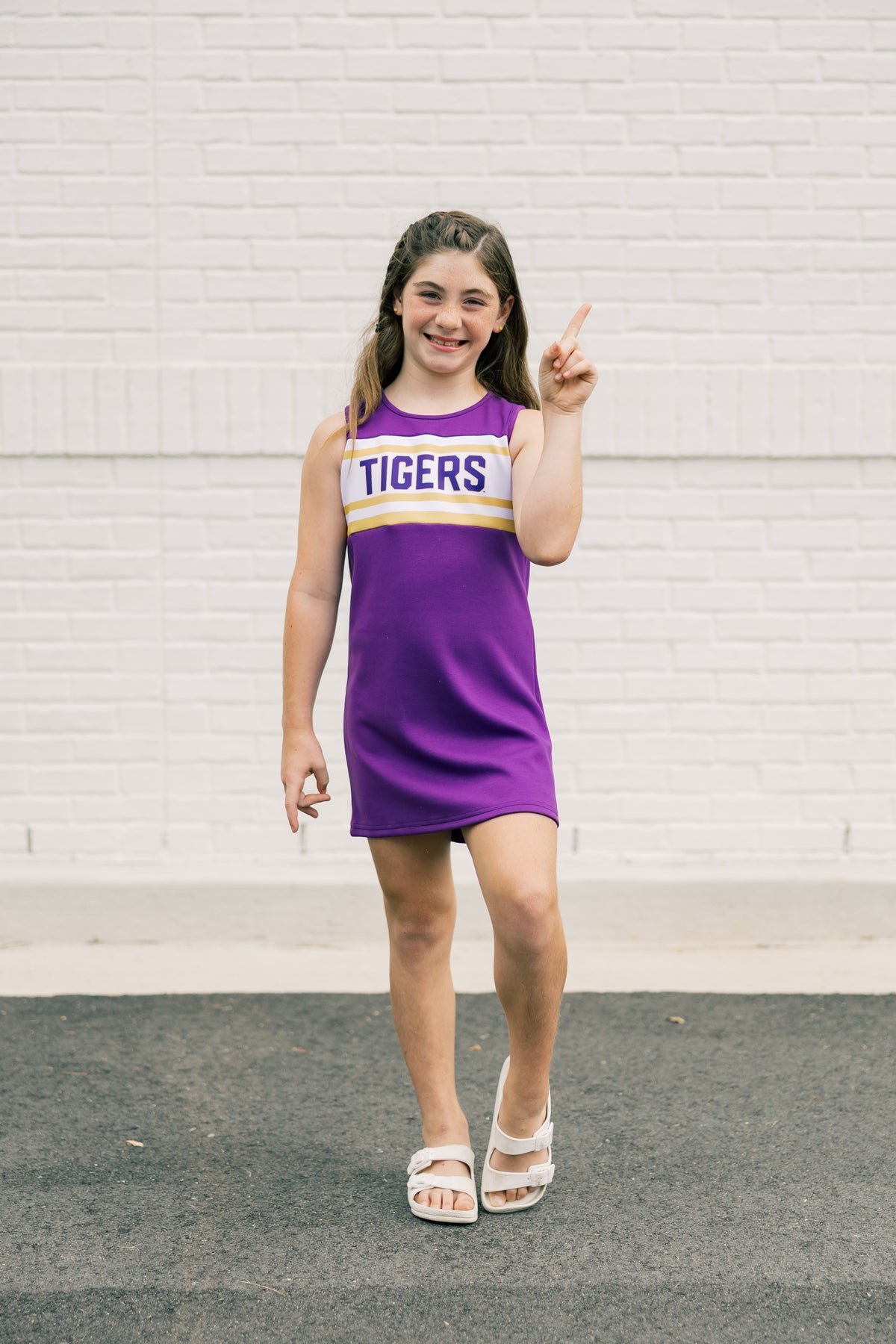 Meet our new officially licensed striped cheer dress! Made of 46% polyester, 46% rayon, and 8% spandex, our dresses are unbelievably soft and so comfortable that your daughter will be ready to cheer on her team all game day long!
