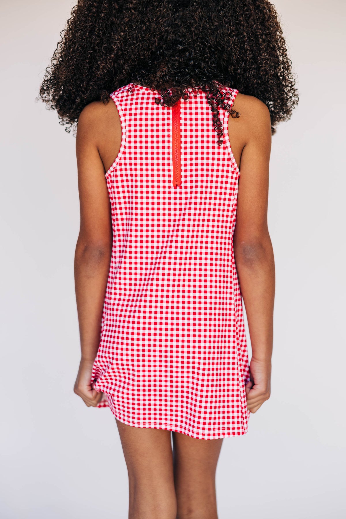Meet your new game day uniform — cute, sporty, and made for real life. The Grace Gingham Dress is perfect for a morning pickleball match, running around with the kids, or cheering on your team. It features a high neckline, an A-line silhouette, and a sleeveless cut that keeps things breezy and flattering. Seaming along the sides adds subtle structure, while a zipper at the upper back makes it easy to slip on and off.