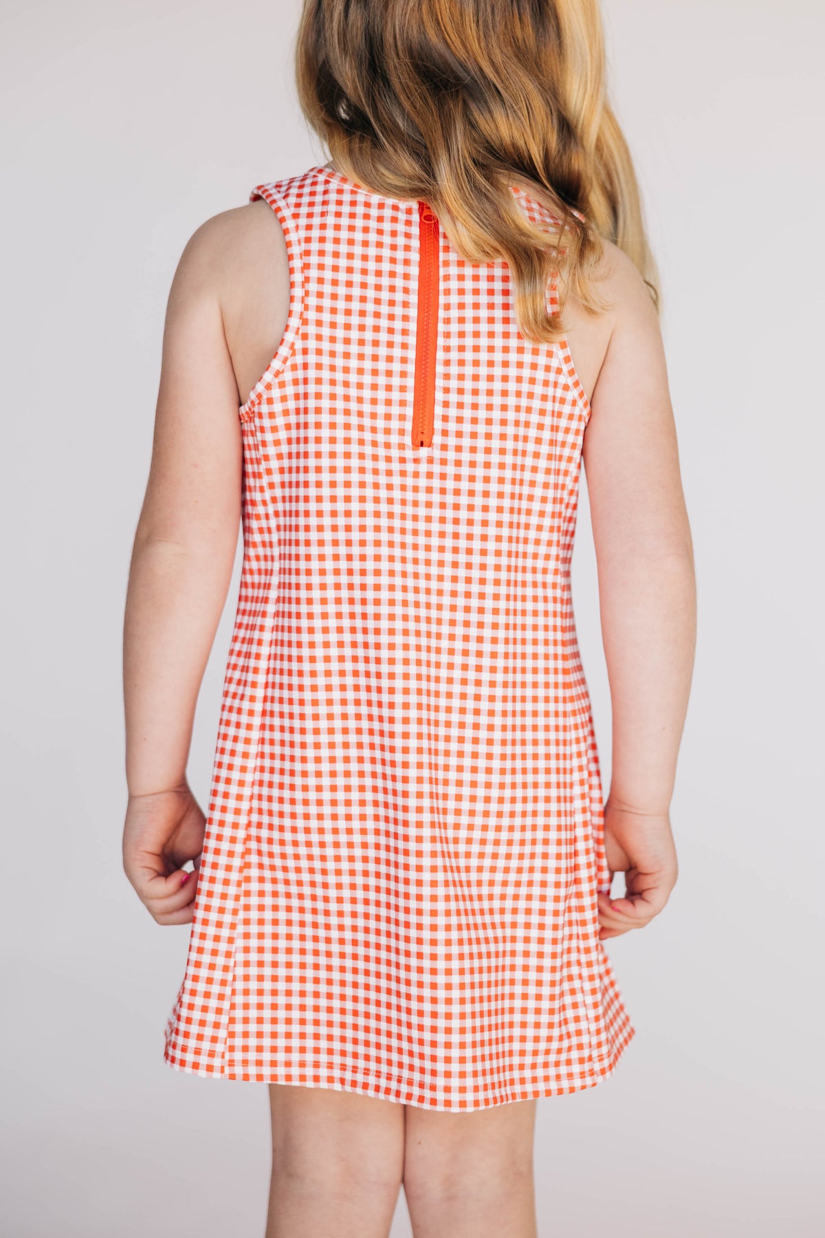 Meet your new game day uniform — cute, sporty, and made for real life. The Grace Gingham Dress is perfect for a morning pickleball match, running around with the kids, or cheering on your team. It features a high neckline, an A-line silhouette, and a sleeveless cut that keeps things breezy and flattering. Seaming along the sides adds subtle structure, while a zipper at the upper back makes it easy to slip on and off.