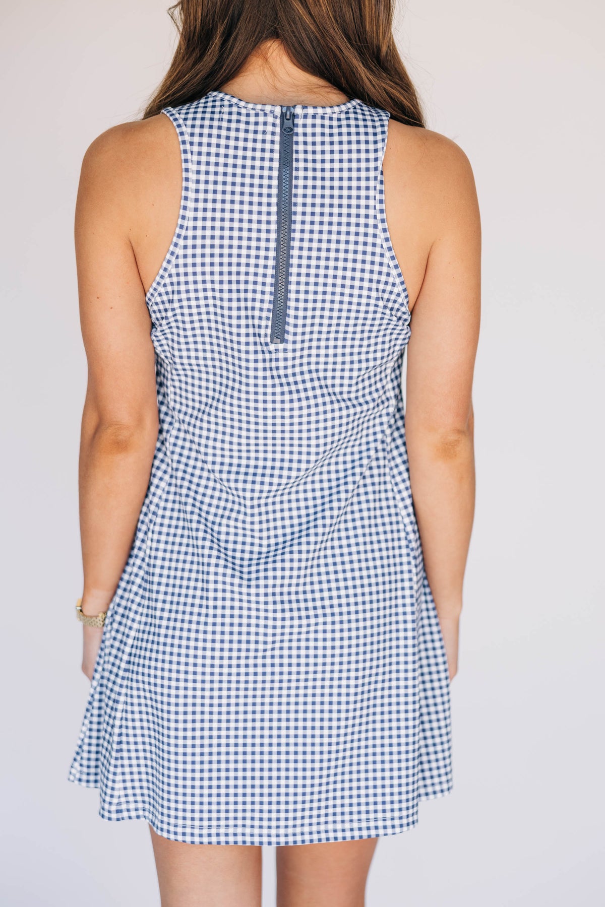 Meet your new game day uniform — cute, sporty, and made for real life. The Grace Gingham Dress is perfect for a morning pickleball match, running around with the kids, or cheering on your team. It features a high neckline, an A-line silhouette, and a sleeveless cut that keeps things breezy and flattering. Seaming along the sides adds subtle structure, while a zipper at the upper back makes it easy to slip on and off.